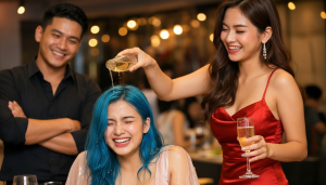Ang pulang alak ay bumuhos sa ulo ni Angela, dumaloy pababa sa kanyang buhok, leeg, at tumagos sa kanyang puting damit.