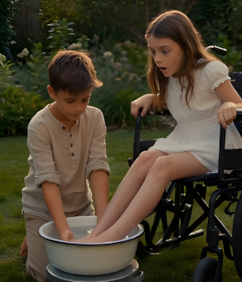 Powietrze wydaje się naładowane. Dziewczyna wciąż siedzi na wózku inwalidzkim, teraz wyraźnie wstrząśnięta, wpatrując się we własne stopy, jakby odkrywała zakazaną prawdę.